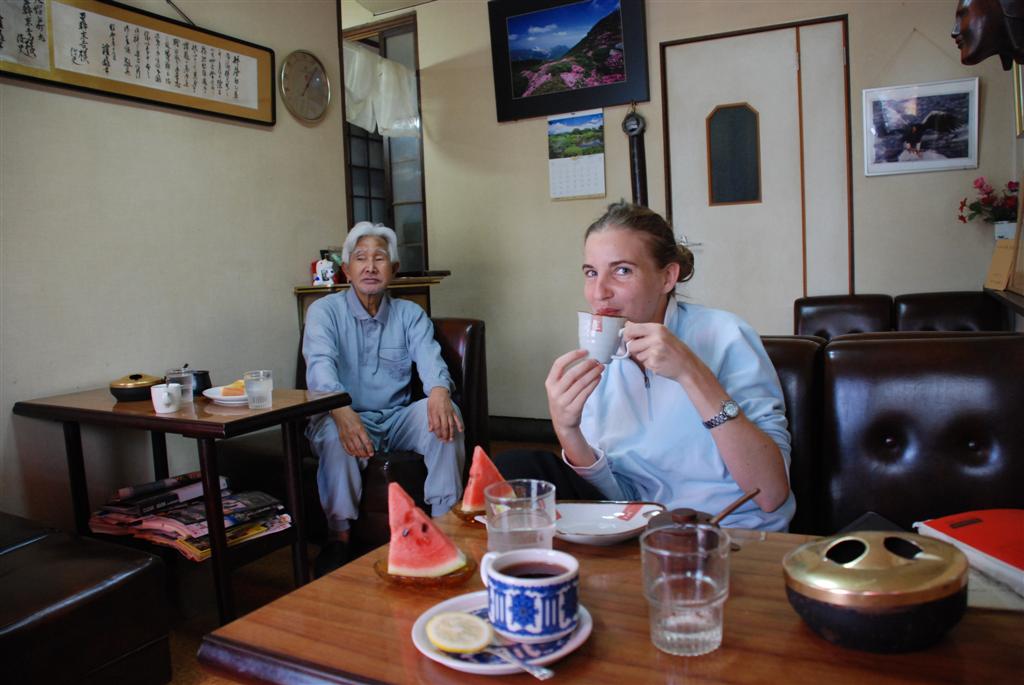 5 juillet 2007. Café, thé au citron, pastèques, prunes au saké, entrain des patrons - tout pour faire de cette pause au salon de thé un moment tout à fait sympathique !
