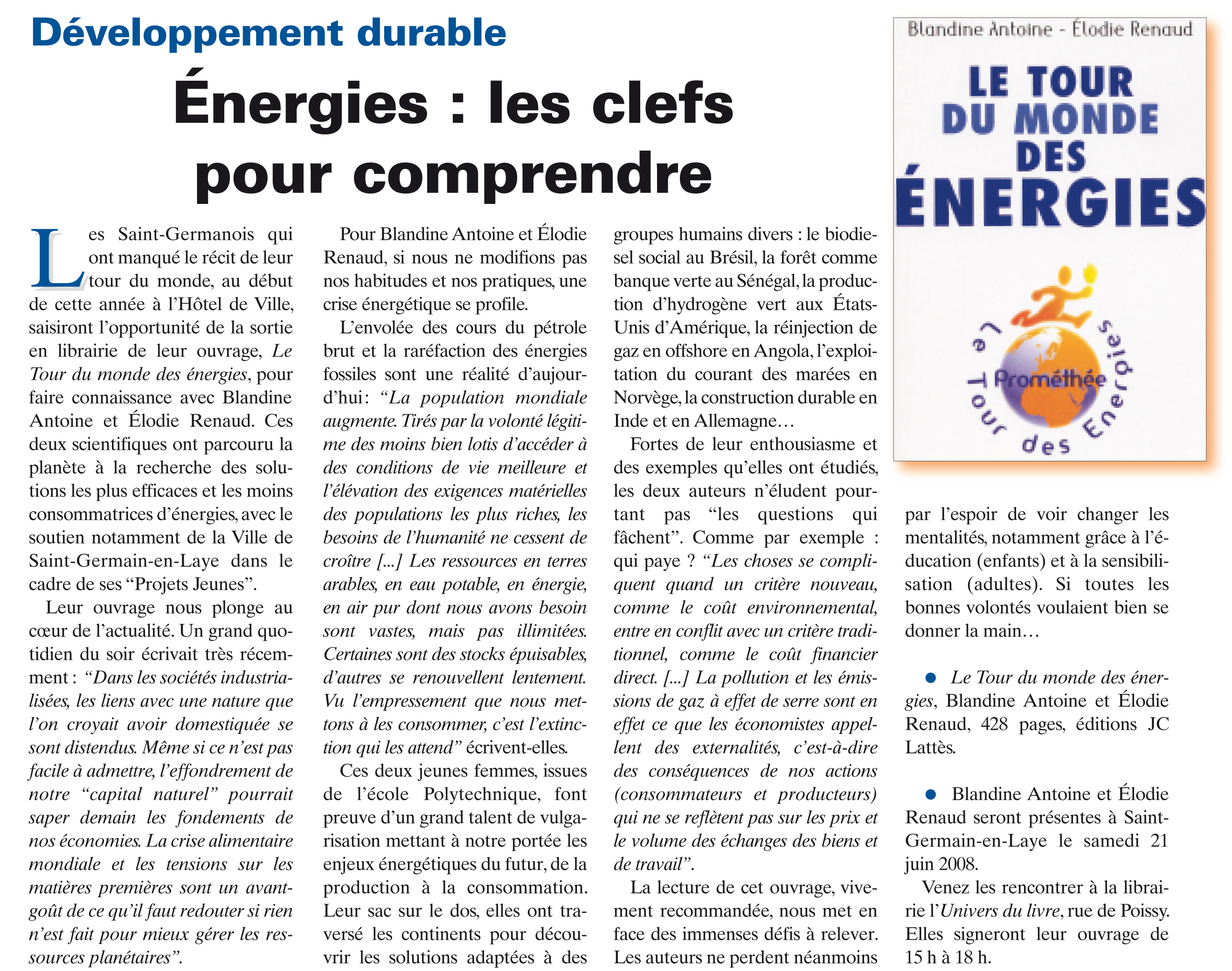 présente le Tour du monde des Energies à ses visiteurs. Un grand merci à l'Amicale des anciens élèves de l'Ecole Polytechnique pour nous avoir ouvert les colonnes de sa revue (La Jaune et la Rouge - cliquer ici pour les articles que nous y avons rédigés) et pour nous avoir permis de boucler le budget du TDE. Aucun commentaire | Poster un commentaire 6 juin 2008 : Le TDE dans le journal de St Germain